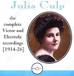 JULIA CULP: The Complete Victor & Electrola Recordings, 1914 - 1926, incl. Liederen van Beethoven, Purcell, Schumann, Schubert, Brahms, Mendelssohn, Liszt, Reger, Gruber, Wolf, Debussy, Weckerlin, Lieurance, de Lange, Kreisler, Horn, Bayley, Rogers, Danks, Molloy, etc.; Arias uit Isræl in Egypt, Elijah & Samson et Dalila. (England) 2-Romophone 81035. Transfers by Seth B. Winner. Het bijgesloten boekje bevat een biografie, foto's en aantekeningen door Alan Blyth.